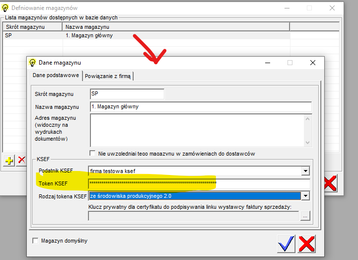 Po uzyskaniu tokena z Aplikacji Podatnika należy przekopiować go do programu Smart System. W zależności od tego w ilu magazynach generujemy faktury to trzeba w definicji każdego z nich wkleić ten token. Trzeba to zrobić w menu Konfiguracja/Definiowanie magazynów: