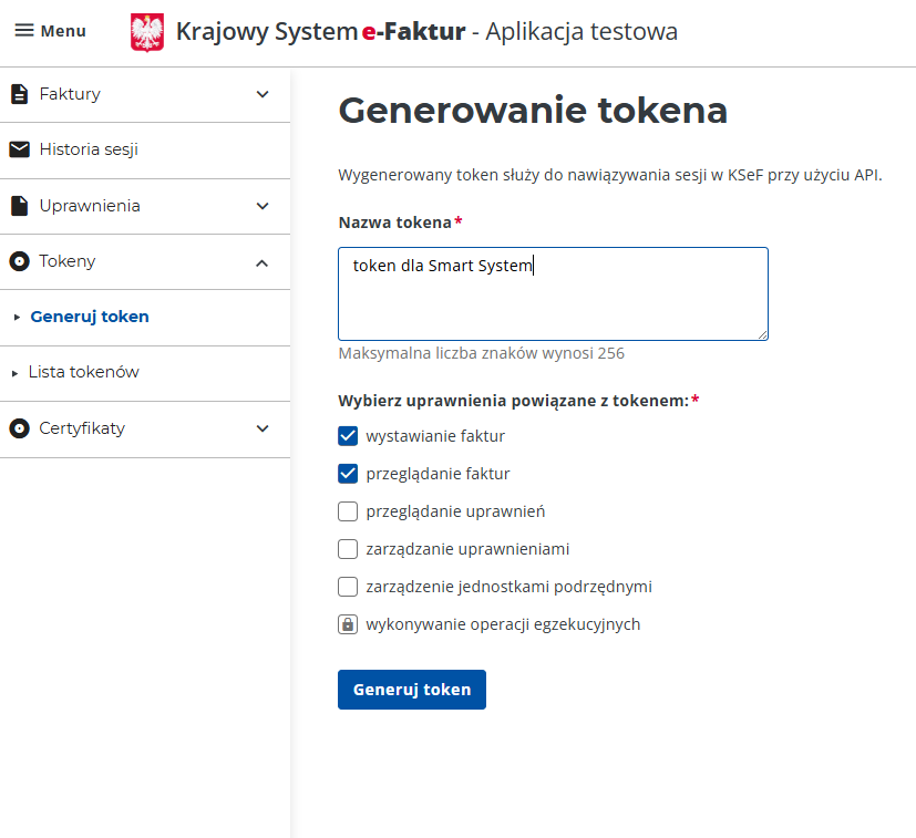 Aby móc przekazywać faktury do systemu KSEF należy wpierw zalogować się do Aplikacji Podatnika (wersja testowa) i wygenerować w niej tzw. token czyli pewnego rodzaju hasło, które umożliwi programowi zewnętrznemu jakim jest Smart System przekazywanie faktur w Twoim imieniu do systemu KSEF lub odbiór faktur zakupu. Token musi zawierać uprawnienia „przeglądanie faktur”, aby program Smart System mógł odczytać dane o fakturach zakupu. Poniżej przykład z Aplikacji Podatnika, w której generowany jest właśnie taki token: