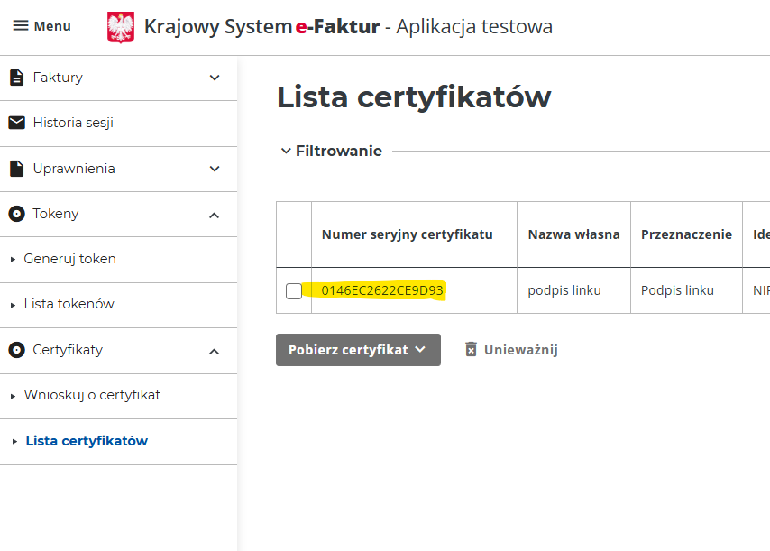 Następnie po naciśnięciu przycisku Generuj zapiszemy na dysku lokalnym plik z kluczem prywatnym. Plik będzie potrzebny za chwilę w programie Smart System. W kolejnym kroku ustalamy przeznaczenie certyfikatu. Tu musimy wybrać „Podpis linku do weryfikacji wystawcy” i klikamy „Wyślij wniosek …”. Po chwili na liście wniosków będzie nasz certyfikat: