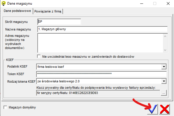 Następnie wracamy do Smart System do okna definiowania magazynu i naciskamy przycisk „…” obok pola klucza prywatnego i wybieramy uprzednio zapisany klucz prywatny z pliku, potem program zapyta się o hasło, a na końcu trzeba wpisać nr seryjny certyfikatu do podpisywania linku. Ostatecznie konfiguracja na magazynie została dokonana i trzeba zapisać dane: