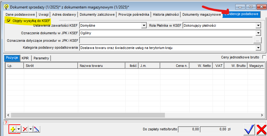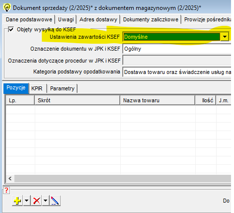 Utworzenie nowego dokumentu spowoduje automatyczne zaznaczenie „Objęty wysyłką do KSEF”: