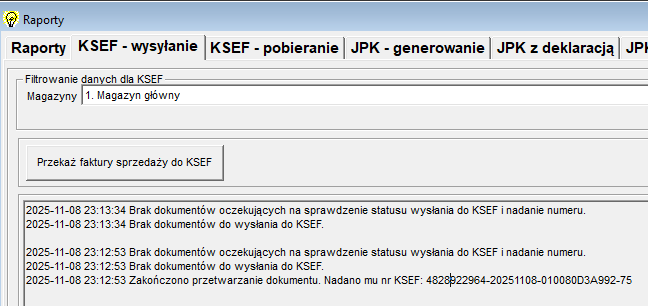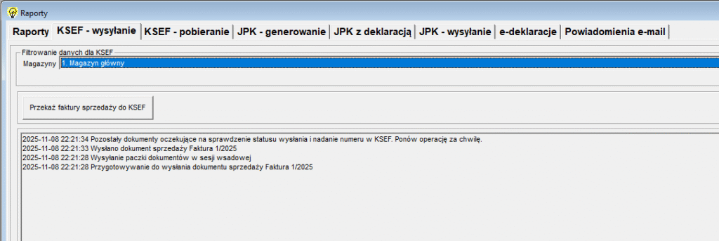 Tam można określić z jakich magazynów będą przekazywane dane do systemu KSEF. Niewybranie magazynu oznacza, że wysyłane będą ze wszystkich magazynów, które zostały skonfigurowane do KSEF i oczywiście jeśli są w nich dokumenty do wysłania. Po wybraniu odpowiednich opcji użycie przycisku „Przekaż faktury sprzedaży do KSEF” spowoduje wysłanie faktur spełniających kryteria do systemu KSEF oraz zwrotnie odebranie z systemu numeru KSEF dla każdego dokumentu. W trakcie wysyłki w oknie komunikatów będzie można śledzić informacje zwracane przez system. Poprawne przesłanie faktury do KSEF oznacza wprowadzenie faktury do obiegu prawnego. Jednocześnie faktura taka staje się widoczna przez odbiorcę (nabywcę z faktury), który od tego momentu może również zobaczyć ją na swoim koncie KSEF.