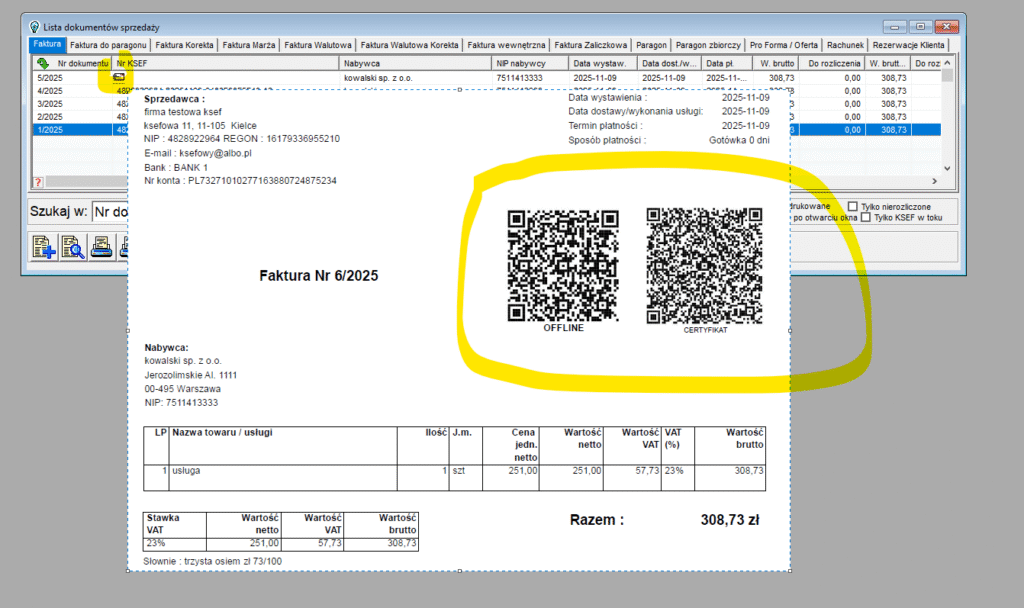 Dokument z tą opcją zostanie wkrótce przekazywany do KSEF oraz na jego wydruku zobaczymy dwa kody QR. Pierwszy kod z napisem OFFLINE służy do weryfikacji faktury przez nabywcę po jej przesłaniu do KSeF, drugi z napisem CERTYFIKAT służy do potwierdzenia autentyczności wystawcy faktury na podstawie certyfikatu KSeF. Nabywca może użyć np. telefonu komórkowego by zeskanować każdy z tych kodów i otworzy mu się strona z potwierdzeniem przesłania faktury/autentyczności wystawcy.