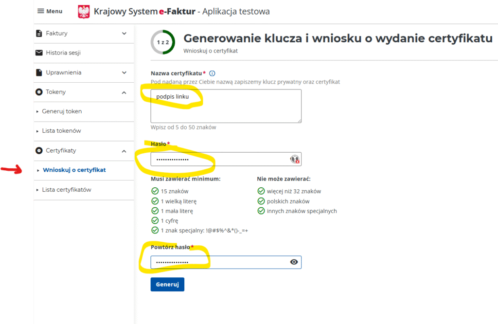 Następnie trzeba uzupełnić pole Klucz prywatny. Aby to zrobić musimy wrócić z powrotem do Aplikacji Podatnika, aby wygenerować certyfikat. Będzie to jednak konieczne tylko jeśli wystawiamy faktury sprzedażowe (a jeśli tylko odbieramy faktury zakupu nie musimy tego pola uzupełniać).  I ponownie jeśli Smart System jest używany dla kilku podmiotów sprzedających to osobno dla każdego z nich należy wygenerować klucz prywatny. A zatem w Aplikacji Podatnika składamy wniosek o wydanie certyfikatu: podajemy nazwę i ustalamy hasło do klucza prywatnego: